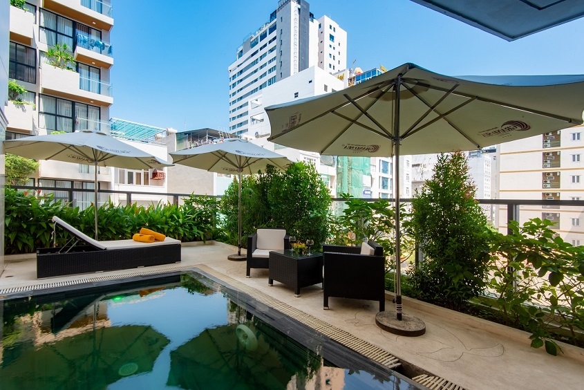 The pool bar is located on the 3rd floor, nearby the swimming pool and gym. It is your best choice to relax yourself in the fresh air surrounding by the green garden and colorful flowers while sipping some cocktails, wine and beer.
